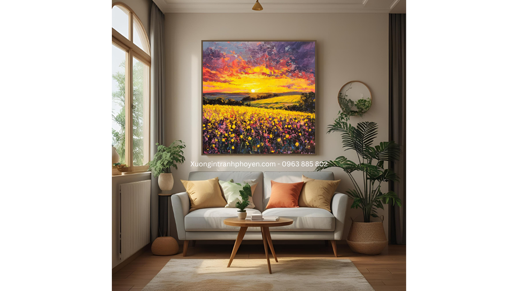 • Ý nghĩa: Phòng khách là trung tâm khí vận, tranh nên mang năng lượng mạnh, rực rỡ, tạo sự ấm áp và thu hút tài lộc.