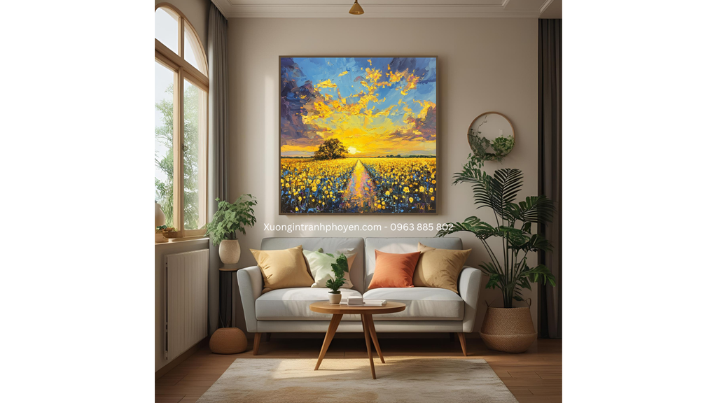 • Ý nghĩa: Phòng khách là trung tâm khí vận, tranh nên mang năng lượng mạnh, rực rỡ, tạo sự ấm áp và thu hút tài lộc.