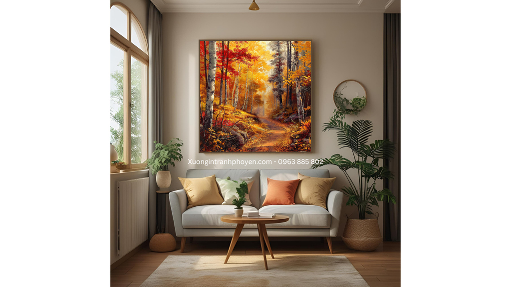 • Tranh phong cảnh rừng cây mùa thu, lá đỏ, lá vàng.