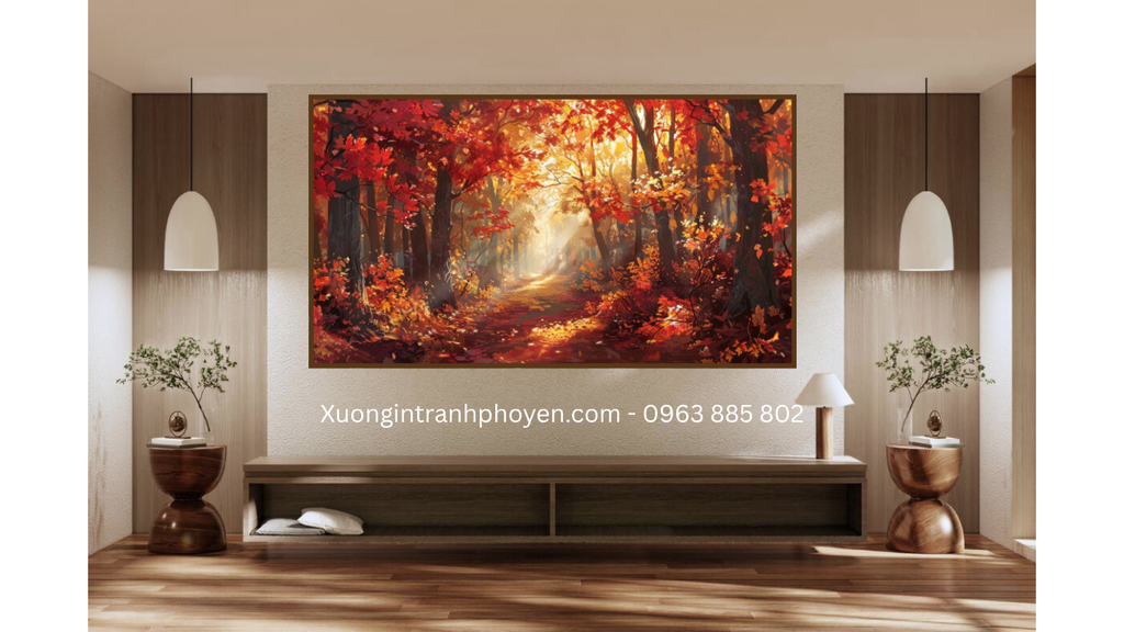 • Tranh phong cảnh rừng cây mùa thu, lá đỏ, lá vàng.