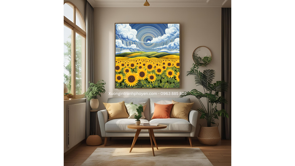 • Tranh đồng quê, cánh đồng lúa: Tông màu vàng nâu, mang lại cảm giác ấm cúng, thịnh vượng.